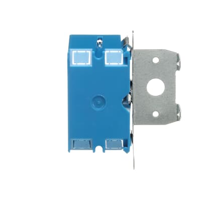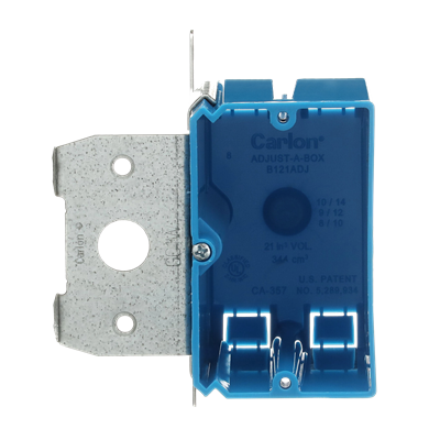 - Brand: CarlonApplication: Designed and listed for use with non-metallic sheathed cable in accordance with Article 314 of the National Electrical CodeColor: BlueCountry of Origin: USCubic Capacity: 21 cu inKnockouts: YesMaterial: PVCMounting: Adjustable BracketNumber Of Outlet: 1Special Features: Patented design allows for adjustment from 0 in. to 1-3/4 in. after installationStandard: UL E11461Type: Outlet Boxes