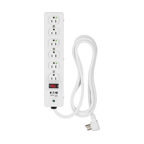 - Tripp Lite Surge Protector, 120 VAC, 15 A, 6 Outlets, 6 ft Cord Length, 50/60 Hz Frequency, Keyhole Mounting, Hospital Grade, Metal Housing Material, NEMA 5-15P Plug, NEMA 5-15R Receptacle, White, 1-1/2 in H x 13-3/4 in W x 2-1/2 in D Dimensions