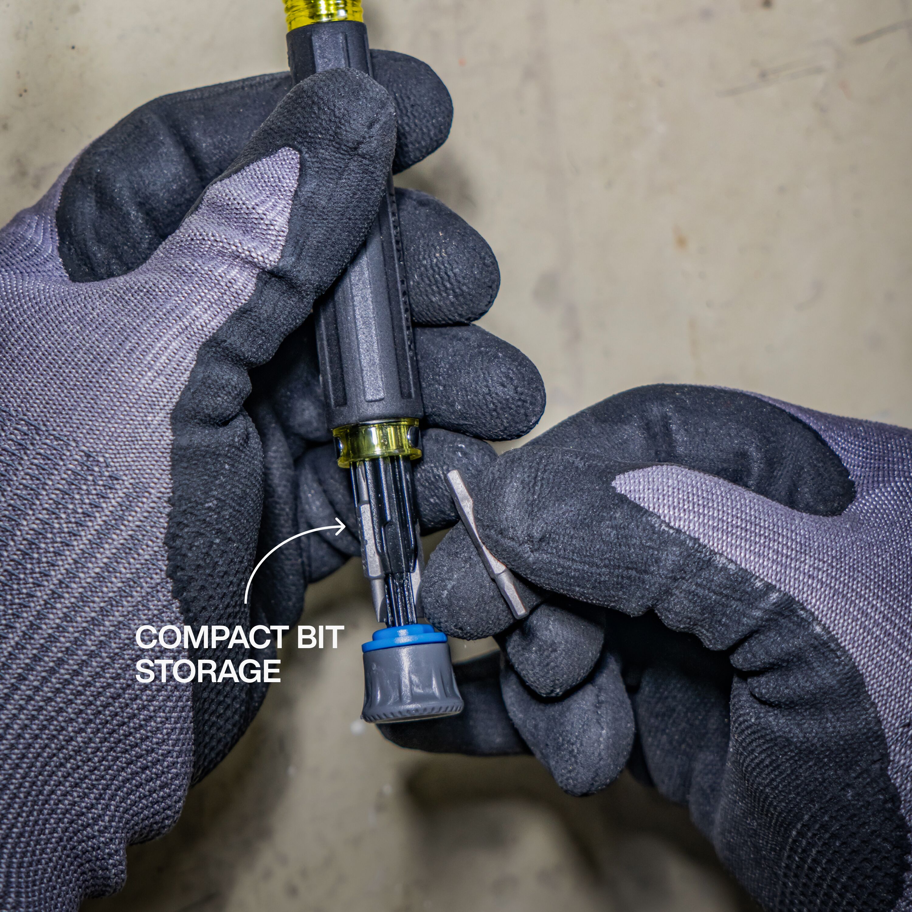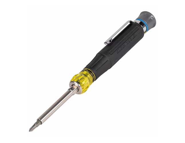 - Brand: Klein ToolsApplication: PrecisionCountry of Origin: TWNHandle Color: Yellow/BlackHandle Material: PlasticOverall Length: 6.51"" (16.5 cm)Special Features: Spin Cap and Cushion-Grip Handle for Great ControlStandard: —Type: Multi-Bit Screwdriver