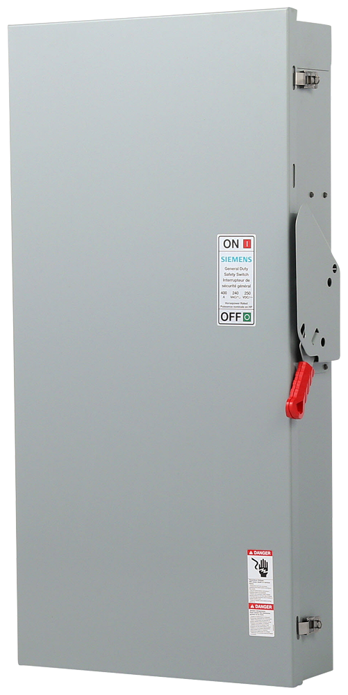 - Siemens Safety Switch, Type VBII Fusible General Duty Low Voltage Single Throw, 240 VAC, 250 VDC, 400 A, 15 hp, 50 hp, 1/3 ph, 60 Hz Frequency, 3 Pole, 4 Wires, 100 kA Short Circuit, TPST Contact Form, NEMA 3R Enclosure, Surface Mounting, Lug Terminal, -29 to 85 deg C, 56 in H x 26 in W x 9.23 in D Dimensions, Steel