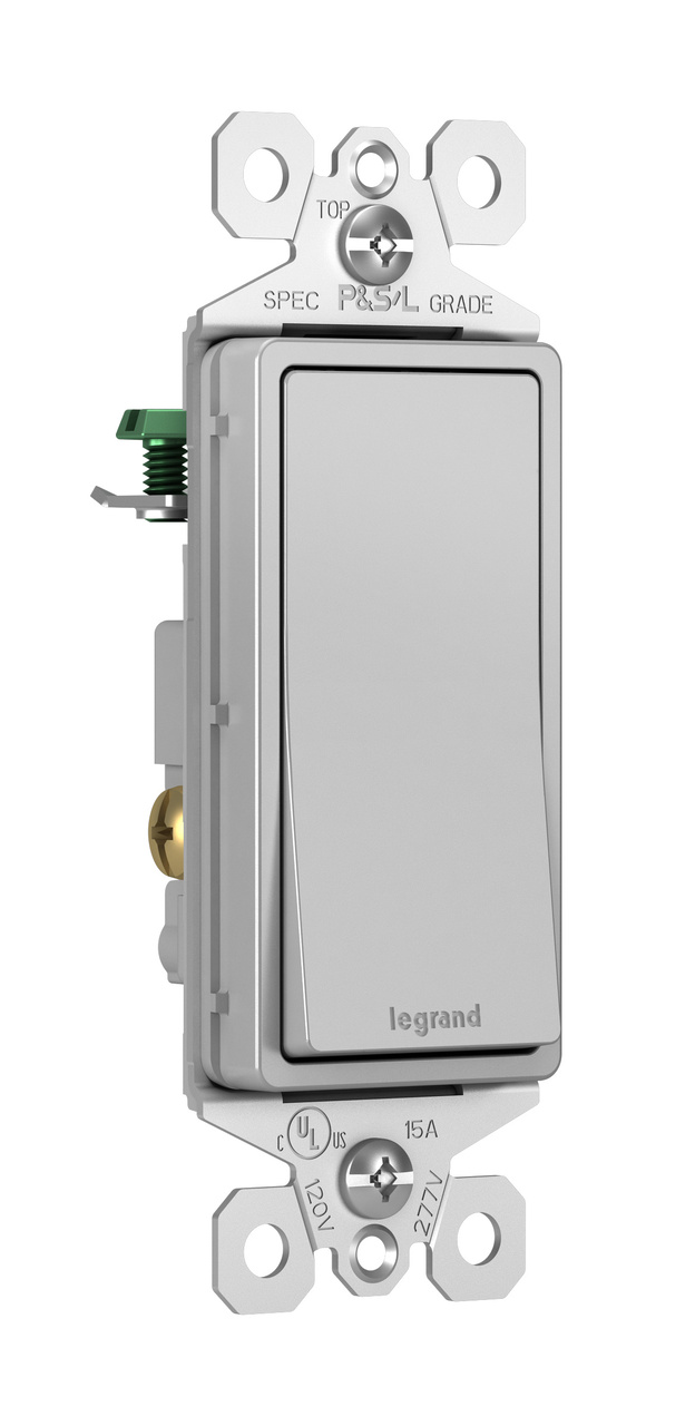 - Brand: Pass & Seymour LegrandApplication: Residential/CommercialColor: GrayContact Rating: 15 Amp, 120/125 VACCountry of Origin: CNGang: 1Insulation: NoneMaterial: ThermoplasticMounting: WallNumber of Poles: Single PoleOrientation: VerticalSize: 6.25""Special Features: Designer style satin finish rocker, push wire 14awg, narrow back bodyStandard: UL, CULUS, UL 20Sub Brand: radiantSwitch Type: PaddleThickness: 2"Type: Switch