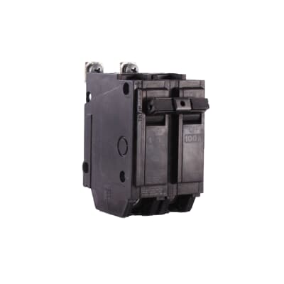 - GE Q-Line® Miniature Circuit Breaker, 120/240 VAC, 100 A, 10 kA Interrupt, THQB Frame, LI/Non-Interchangeable Thermal Magnetic Trip, 2 Pole, 1 ph, 6 to 1/0 AWG Wire, Bolted-On Mounting, 60 to 75 deg C, 2-3/8 in L x 2 in W x 3-9/32 in H Dimensions