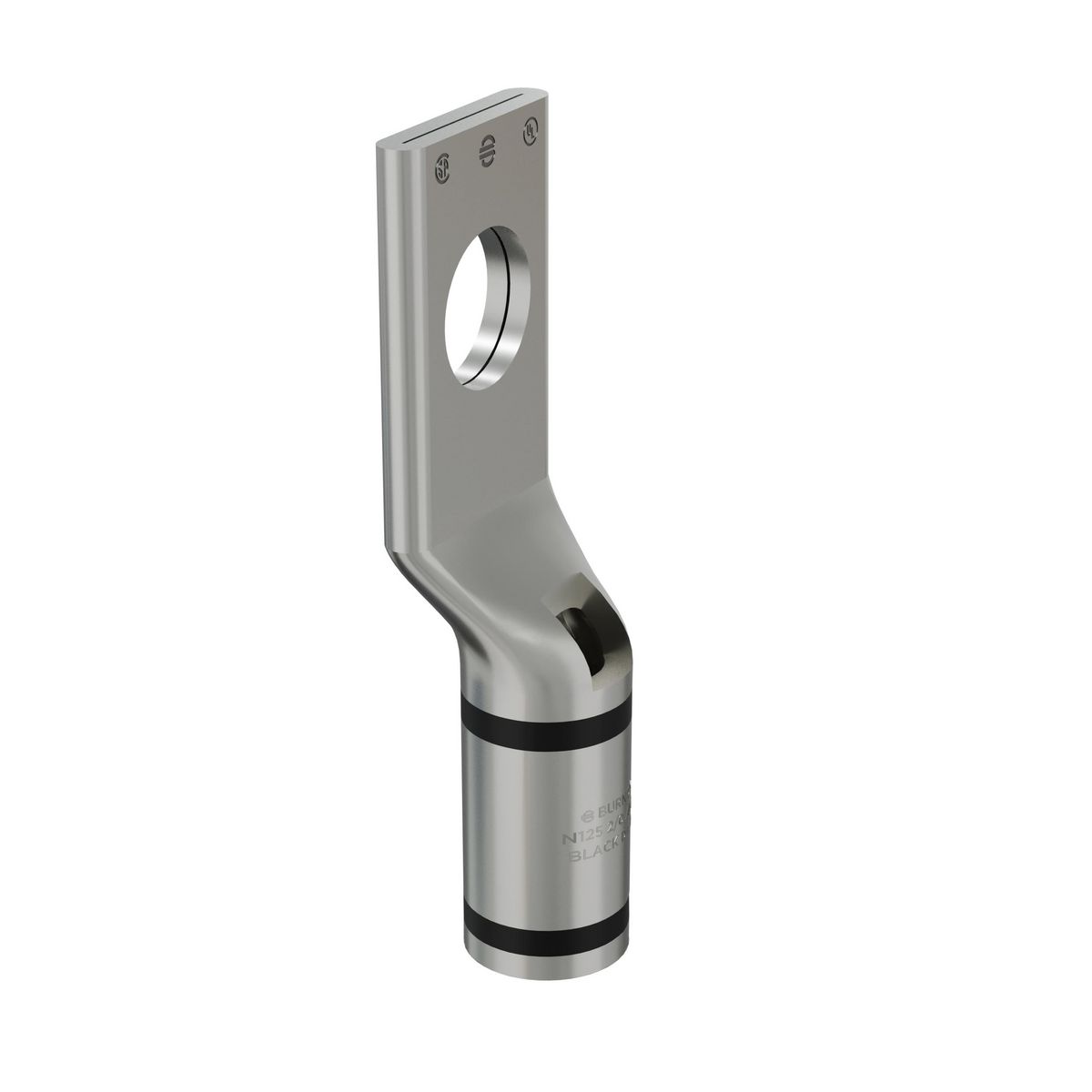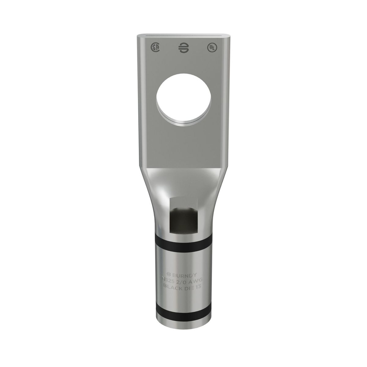 BURNDY® HYLUG™ Compression Lug, 1-Hole, Series: YA-L, Stranded Copper Conductor, 2/0 AWG Conductor, Die Code: 13, 600 VAC to 35 kV, 3/8 in Stud, Standard/Straight Tongue, 0.83 in W x 0.12 in THK Tongue, 2.19 in Overall Length, Chamfered/Short/Skived/Standard Barrel, 0.94 in L Barrel, 1 in L Wire Strip, Tin Plated, 90 deg C, Copper, Black