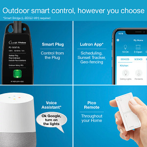 - Brand: Lutron Dimming ProductsApplication: Lighting ControlColor: BlackCountry of Origin: MXEnvironmental Conditions: 0 to 100% humidityOperating Temperature: -4 to 122 FStandard: cULus listed|FCC approved|Industry Canada certified|IFTEL certifiedSub Brand: CasetaType: Outdoor Smart PlugVoltage Rating: 120