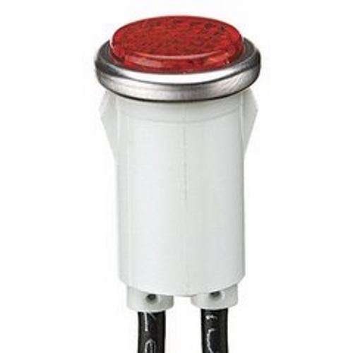 - IDEAL® Indicator Light, 125 VAC/VDC, 2 mA, 0.33 W Wattage, Flush Lens, Red Lens, Polycarbonate Lens, Neon Lamp, Bezel/Housing: Nylon/Stainless Steel Bezel, 0.91 in H Size, Round Shape, 25000 hr Average Life, Lead Wire Terminal, Environmental Conditions: 140 deg C Body, 135 deg C Lens Operating Temperature