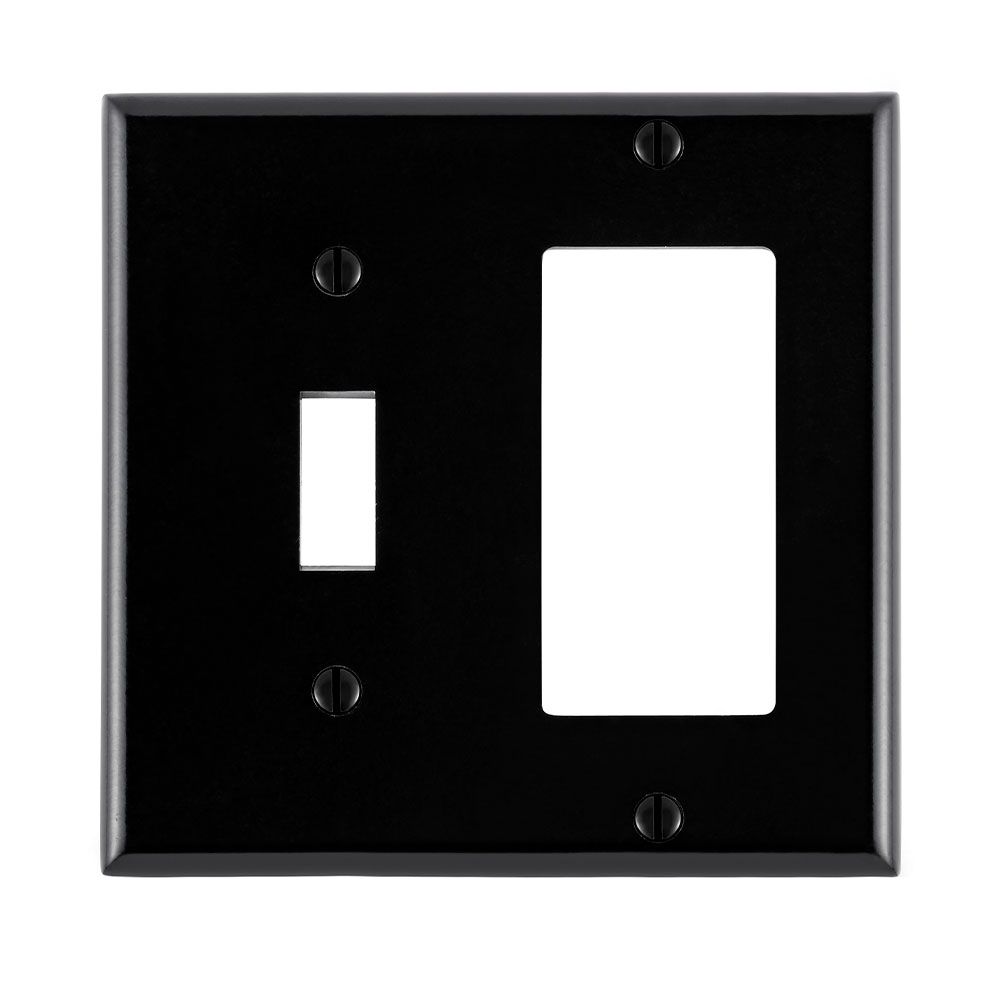- Leviton®, 80405-E, Combination Wall Plate, Standard Size, 2 Gangs, 4.56 in W x 4.5 in H Size, 0.942 in H x 0.406 in W Toggle, Decorator/GFCI Cutout, Surface Mounting, 0.22 in Thickness, Thermoset, Black, Smooth