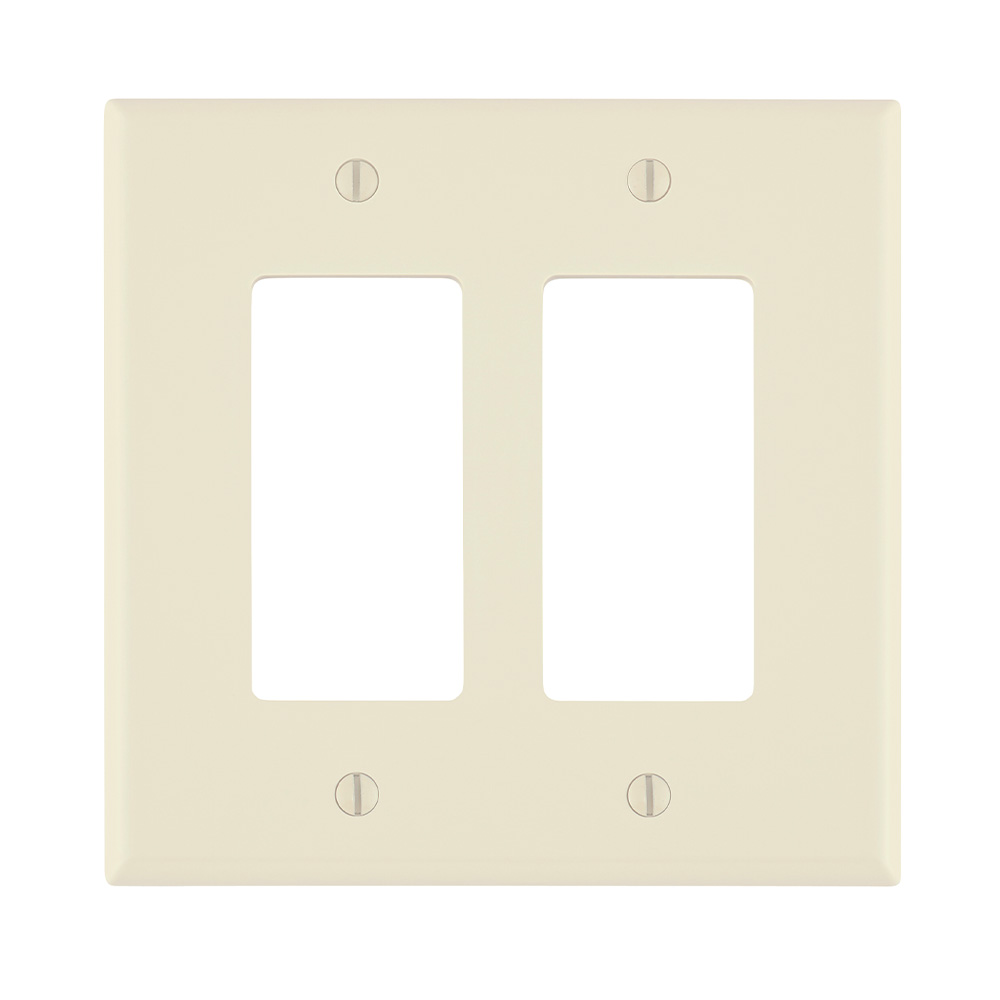 - Leviton®, PJ262-T, Wall Plate, Midway Size Screwless, 2 Gangs, 4.94 in W x 4.88 in H Size, Decorator/GFCI Device Cutout, Surface Mounting, Molded Construction, 1/4 in Thickness, Thermoplastic, Light Almond, Smooth