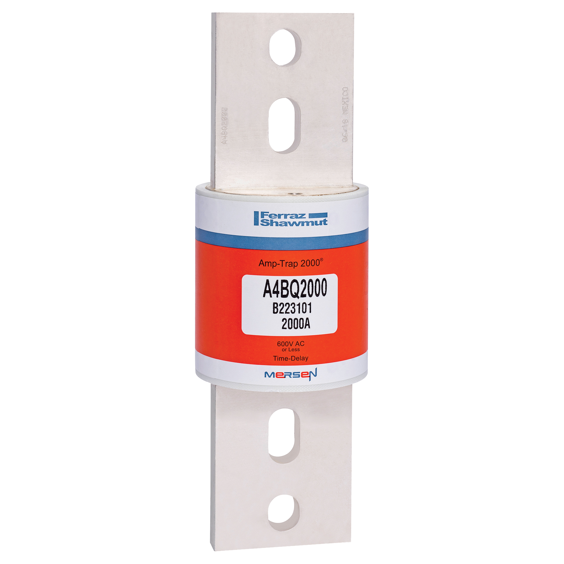 - Mersen AMP-TRAP® 2000 SmartSpot® Power Fuse, Current Limiting Low Voltage North American Time Delay, Series: A4BQ, Non-Indicating, Rejection, 2000 A, 600 VAC, 200 kA Interrupt, Class: L, 4 s at 500% Response, Blade Terminal, Bolted-On Mounting, Cylindrical Body, Dual Element, Fiberglass, 3-1/2 in Dia x 10-3/4 in L Body