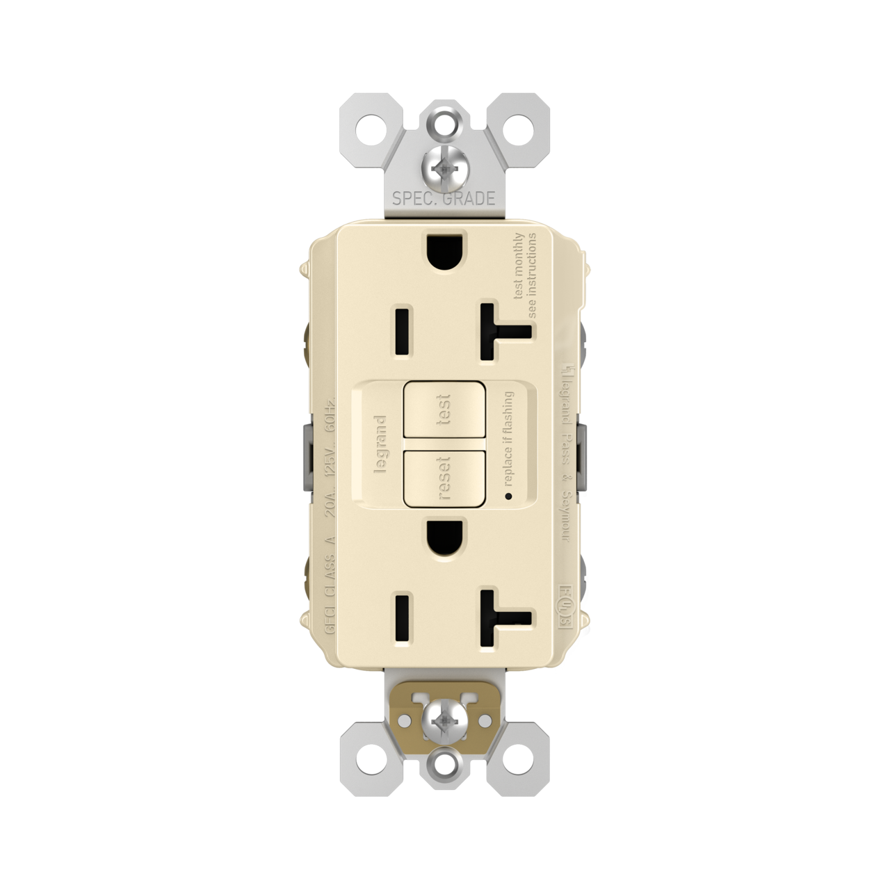 - Pass & Seymour Radiant GFCI Receptacle, Duplex Self-Test, Series: 2097, 125 VAC, 20 A, 60 Hz Frequency, 2 Pole, 3 Wires, NEMA 5-20R NEMA Rating, Specification Grade, -35 to 66 deg C, Back/Side Wire/Screw Terminal, Nylon/Thermoplastic, Light Almond, 1.03 in L x 1.73 in W x 4.2 in H Dimensions