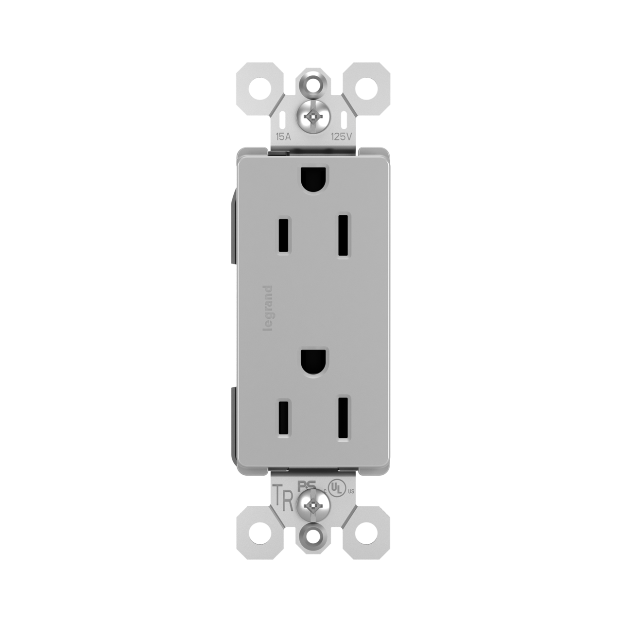 - Pass & Seymour Straight Blade Receptacle, 2-Gang Decorator Tamper Resistant, 125 VAC, 15 A, 2 Pole, 3 Wires, NEMA 5-15R NEMA Rating, Commercial/Residential Grade, Side Wire Terminal, Thermoplastic, Gray, 4.25 in H x 1 in W x 1.29 in D Dimensions