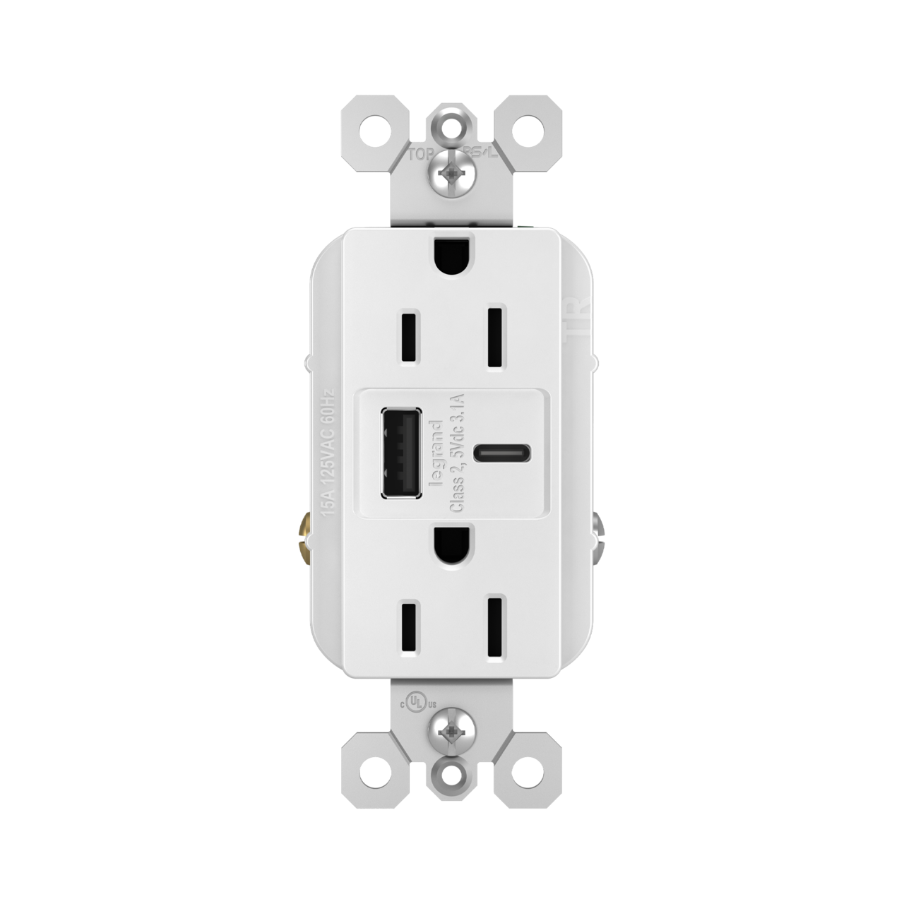 - Pass & Seymour radiant USB Charger, Hybrid, 125 VAC, 15 A Electrical Rating, 14 to 10 AWG Wire, Type-A USB 2.0/C USB, 3.1 A USB, 4.18 in H x 1.69 in W x 1.35 in D Size, Screw Connection, Wiring Method: Back/Side Wired, Polycarbonate, White, Environmental Conditions: -40 to 60 deg C Operating Temperature