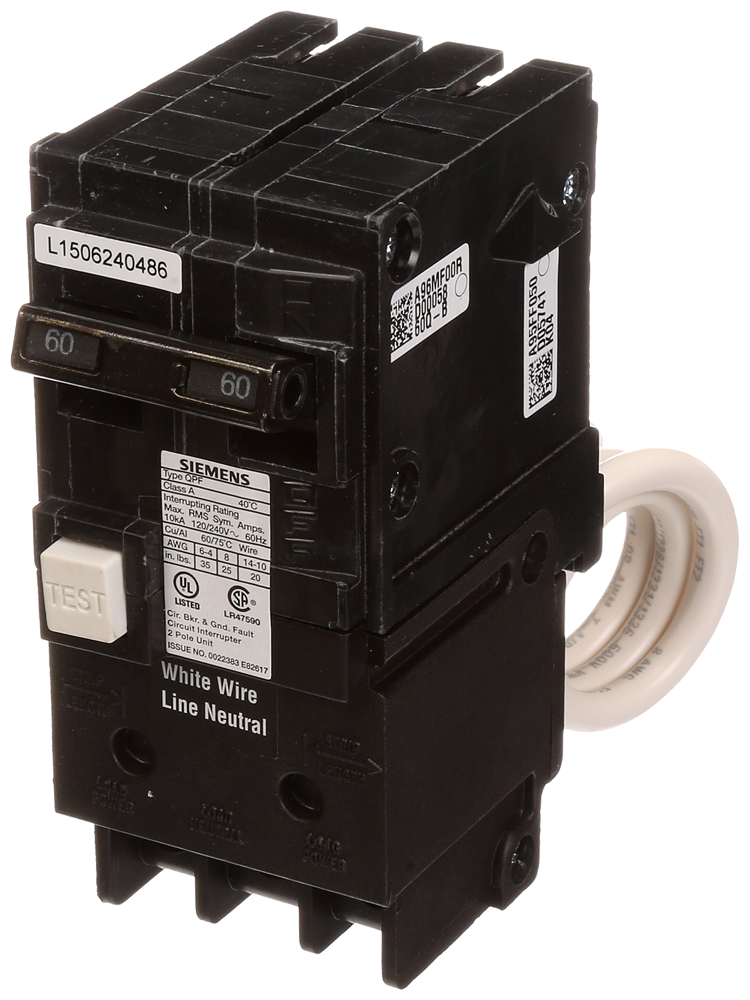 - Siemens, QF260A, Ground Fault Circuit Breaker, Type GFCI, 120/240 VAC, 60 A, 10 kA Interrupt, QPF2 Frame, Thermal/Magnetic Trip, 2 Pole, Plug-In Connection, 12.7 in L x 6.8 in W x 7.9 in H Dimensions