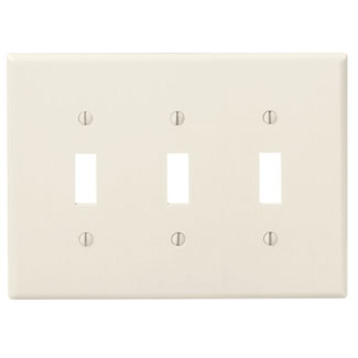 Part #LEV 80511-T PJ3-T Leviton®, 80511-T, Wall Plate, Midway Size Traditional, 3 Gangs, 6-3/4 in W x 4-7/8 in H Size, 0.942 in H x 0.406 in W Toggle Switch Cutout, Surface Mounting, 0.255 in Thickness, Thermoset, Light Almond, Smooth
